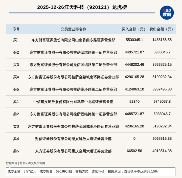 每经讯,2025年12月26日,北交所上市公司江天科技(920121,收盘价:51.99元)登上龙虎榜,交易方式是连续竞价,披露原因是当日换手率达到58.10%股民股票配资论坛,成交数量690.99万股,成交金额3.57亿元。买一席位为东方财富证券股份有限公司山南香曲东路证券营业部,买入553.03万元;卖一席位为中信建投证券股份有限公司武汉中北路证券营业部,卖出674.51万元。